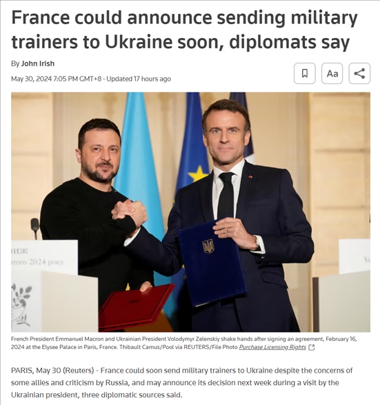 5月30日,路透社援引三位匿名外交消息人士稱,法國可能很快會向烏克蘭派遣軍事教官。