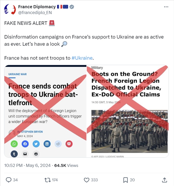 5月6日,法國外交部在X平臺上明確表示,“法國還沒有向烏克蘭派兵?!?/p>