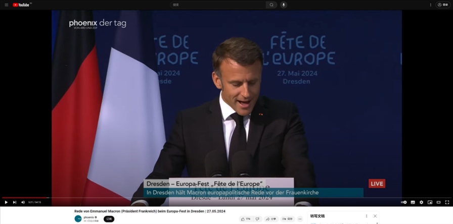 Phoenix在其YouTube頻道上播出的馬克龍演講的完整版本截圖。網傳視頻顯示的音頻內容與Phoenix播出的馬克龍在德累斯頓進行演講時開篇的音頻一致,且拍攝現場的環(huán)境高度吻合。