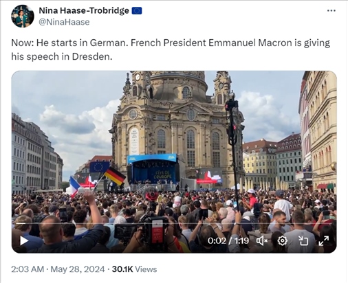 X平臺用戶@NinaHaase在28日凌晨2點03分發(fā)布的推文截圖,稱“現在,法國總統(tǒng)埃馬紐埃爾·馬克龍正在德累斯頓發(fā)表演講,他開場用了德語”,沒有提到法國軍隊。