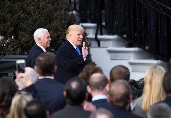2017年12月20日,在美國華盛頓白宮,時任美國總統(tǒng)特朗普(右)和副總統(tǒng)彭斯準備就國會通過稅改法案發(fā)表講話。新華社記者殷博古攝