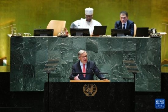 9月24日,在位于紐約的聯(lián)合國(guó)總部,聯(lián)合國(guó)秘書(shū)長(zhǎng)古特雷斯(前)在第79屆聯(lián)合國(guó)大會(huì)一般性辯論開(kāi)幕式上致辭。新華社記者 李睿 攝
