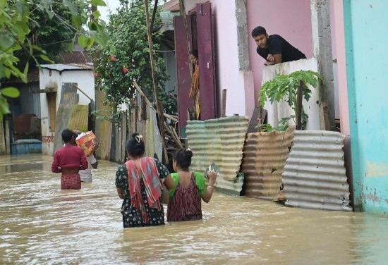 8月20日,在印度阿加爾塔拉市郊,人們走在積水的道路上。新華社發(fā)