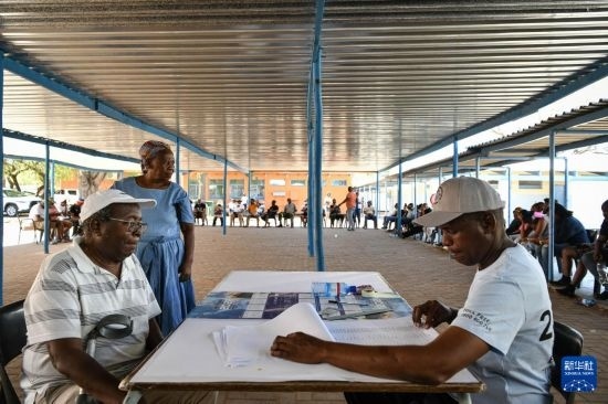 10月30日,選民(右)在博茨瓦納南部區(qū)莫舒帕村的一處投票站投票。新華社記者 韓旭 攝