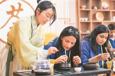 2024年4月15日,2024年“漢語橋”上海合作組織國家青年學(xué)生春令營開營儀式在新疆師范大學(xué)舉行。來自8個(gè)上合組織國家的近500名青年學(xué)生參加了此次春令營。圖為參加春令營的來華青年學(xué)生在新疆師范大學(xué)學(xué)生(左)的指導(dǎo)下學(xué)習(xí)茶藝。