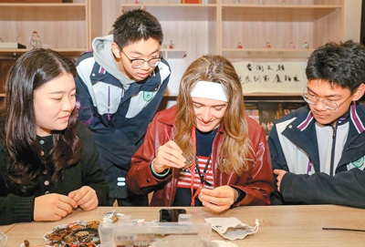 在學(xué)校藝術(shù)中心、體育中心和學(xué)生發(fā)展中心,美國青少年體驗了衡水中學(xué)學(xué)生豐富的課余生活。小小的玻璃壺坯內(nèi),手繪細(xì)膩的內(nèi)畫;一張?zhí)镒指裥埳?,學(xué)寫毛筆書法;面塑課堂上,彩色面團捏出多般造型;乒乓球桌上,與中國學(xué)生展開球技對壘……一堂堂社團課程,讓美國青少年近距離感知立體、生動的中國教育。