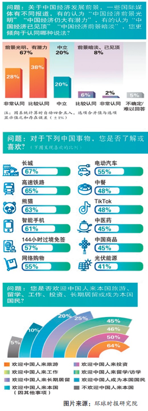 本次調(diào)查還列舉了10余項(xiàng)有代表性的中國(guó)事物,并逐一向國(guó)外民眾詢問(wèn)喜愛(ài)與否。其中,長(zhǎng)城(67%)、高鐵(65%)、熊貓(63%)、智能手機(jī)(61%)的獲喜愛(ài)比例超過(guò)六成,過(guò)境免簽(57%)、電動(dòng)汽車(chē)(55%)和網(wǎng)絡(luò)購(gòu)物(55%)的獲喜愛(ài)比例超過(guò)半數(shù),中餐(48%)和TikTok(48%)的獲喜愛(ài)比例接近半數(shù)。