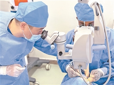 “光明行”項目專家團隊正在為當?shù)鼗颊邔嵤┌變?nèi)障手術(shù)。