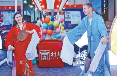 馬克西姆(右)和葉卡捷琳娜在“村越”現(xiàn)場(chǎng)體驗(yàn)越劇服裝。