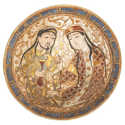 米納伊彩人物花卉銘文釉陶碗為核心展品之一。它產(chǎn)于公元12—13世紀,內(nèi)壁中央繪有一對戀人,這是古代伊朗常見的藝術(shù)插圖題材。這對戀人的形象具有明顯的東亞人特征,男子手中握著一個精致的酒杯,似乎在向他的愛人敬酒。人物周圍環(huán)繞著平行和扭曲的阿拉伯式花紋,碗口在一圈鈷藍底上飾有金色庫法體文字。