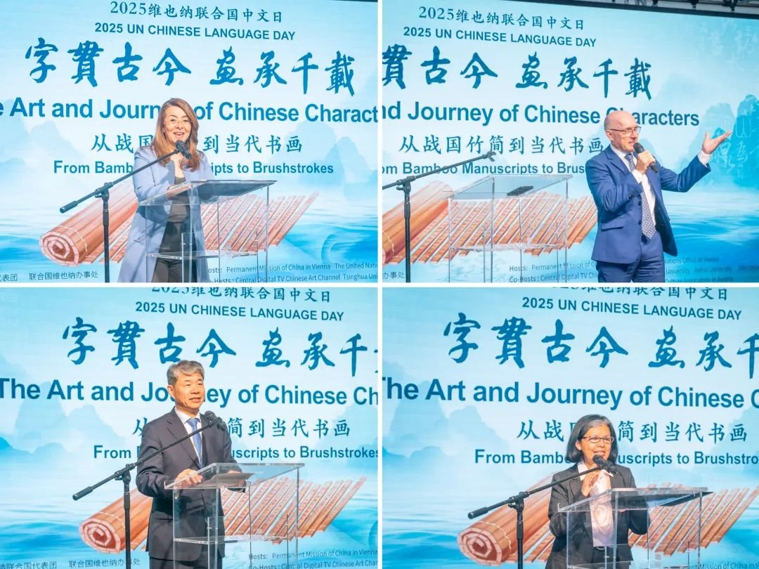 此次中文日活動以“字貫古今 畫承千載——從戰(zhàn)國竹簡到當代書畫”為主題,由中國常駐維也納代表團、聯(lián)合國維也納辦事處主辦,中央數(shù)字電視書畫頻道、清華大學、安徽大學、吉林大學協(xié)辦,共同為維也納聯(lián)合國總部獻上了一場中國文化盛宴。清華大學副校長彭剛、中央數(shù)字電視書畫頻道董事局主席王平在開幕式致辭,探討了文字、文化、文明三者之間的緊密關系和文明交流互鑒的重要意義。