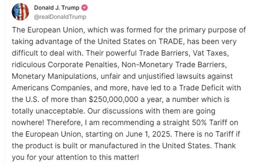 針對(duì)歐盟,特朗普寫道:“歐盟一直很難打交道,它成立的初衷主要是在貿(mào)易上占美國便宜。他們?cè)O(shè)置的高額貿(mào)易壁壘、增值稅、荒謬的企業(yè)罰金、非貨幣貿(mào)易障礙、貨幣操縱,以及對(duì)美國企業(yè)發(fā)起的不公平且毫無根據(jù)的訴訟,已導(dǎo)致美國每年對(duì)歐貿(mào)易逆差超過2.5億美元——這個(gè)數(shù)字完全不可接受!”