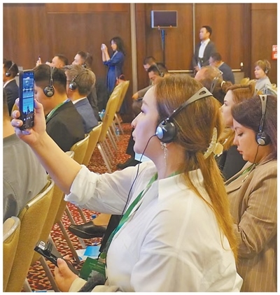 參加2025中國—中亞媒體合作論壇報道的中亞國家媒體記者正在拍攝視頻。