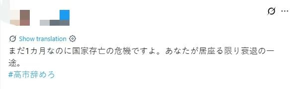 還有網(wǎng)友批評稱,高市上臺僅僅一個月,日本就面臨國家生存危機,如果高市繼續(xù)當(dāng)首相,國家會走向衰落。