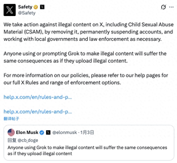 X表示,平臺(tái)會(huì)對(duì)非法內(nèi)容采取行動(dòng),包括刪除資料、封號(hào),并在必要時(shí)與執(zhí)法機(jī)構(gòu)展開合作。馬斯克也在周末的一條帖子中強(qiáng)調(diào),任何使用“格羅克”制作非法內(nèi)容的人,將面臨與上傳非法內(nèi)容同樣的法律后果。
