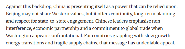 文章認(rèn)為,在此背景下,中國是可靠力量。中國提供了連續(xù)性、長期規(guī)劃和尊重國家間的交流。中國強(qiáng)調(diào)不干涉、經(jīng)濟(jì)伙伴關(guān)系和對(duì)維護(hù)全球貿(mào)易。對(duì)于那些正面臨增長緩慢、能源轉(zhuǎn)型和供應(yīng)鏈脆弱的國家來說,這一主張具有不可否認(rèn)的吸引力。另外,中國與美國不同,中國并不要求合作時(shí)必須實(shí)現(xiàn)意識(shí)形態(tài)上的一致性。中國提供市場、投資和交流。在不確定的時(shí)代,這些反而更體現(xiàn)了一種穩(wěn)定。