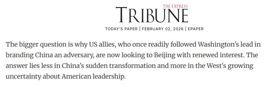 巴基斯坦《論壇快報(bào)》2日的一篇文章指出,為何曾緊跟華盛頓將中國視為“對(duì)手”的西方盟友們,如今對(duì)中國重燃興趣?答案不是中國的突然轉(zhuǎn)變,而是西方對(duì)美國不確定性日益加深的疑慮。