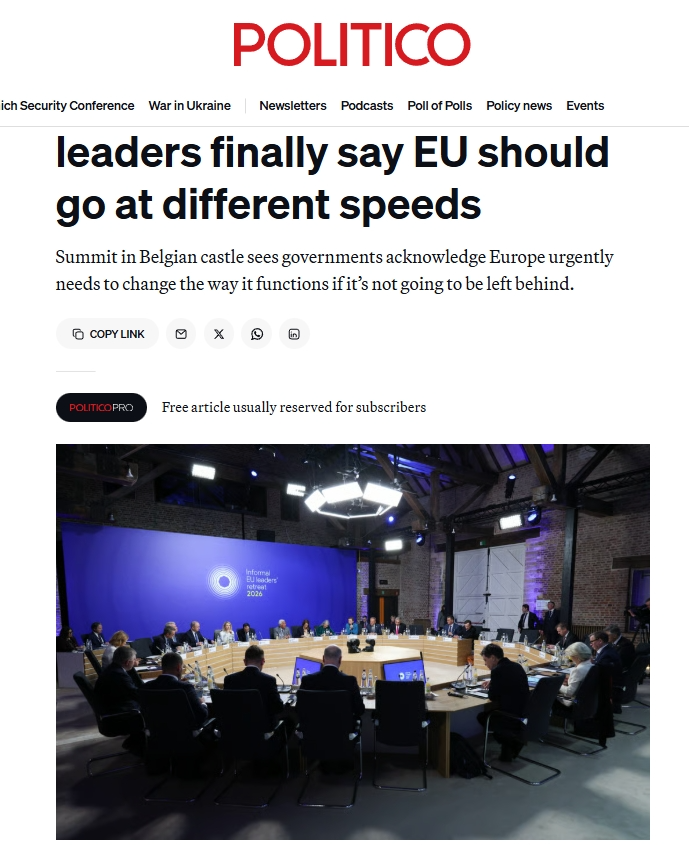《政治報(bào)》網(wǎng)站歐洲版的報(bào)道評論稱,歐盟一直以其成員國團(tuán)結(jié)一致向前邁進(jìn)而自豪,那個(gè)時(shí)代已經(jīng)結(jié)束了。2月12日在比利時(shí)舉行的會議上,法國、德國、意大利等多國領(lǐng)導(dǎo)人支持,最早將于下個(gè)月的歐洲理事會上形成一項(xiàng)計(jì)劃,以簽署組成更小團(tuán)體的倡議。各國政府表示,由于歐洲的許多想法陷入優(yōu)柔寡斷和不和諧之中,歐洲的競爭優(yōu)勢正在逐漸消失,因此他們感到一種緊迫感。