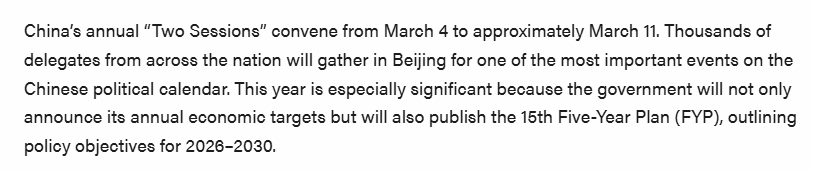 文章說,今年的兩會尤為關(guān)鍵,將為第十五個(gè)五年規(guī)劃(2026-2030年)奠定基礎(chǔ)。投資者應(yīng)關(guān)注比往年更明確的政策信號,特別是在產(chǎn)業(yè)升級、科技自主和經(jīng)濟(jì)安全等領(lǐng)域。
