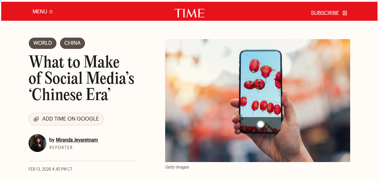 美國《時(shí)代》周刊網(wǎng)站2月13日的一篇文章稱,伴隨著今年的中國新年,社交網(wǎng)絡(luò)上介紹中國文化的內(nèi)容不少。這是一種新的趨勢,美國社交媒體用戶視自己為“中國人”,擁抱“Chinese era”(中國時(shí)代)或者“Chinamaxxing”(極致中國化)。觀察家分析,這一趨勢反映了隨著中國的開放和軟實(shí)力的提升,人們對中國越來越著迷。
