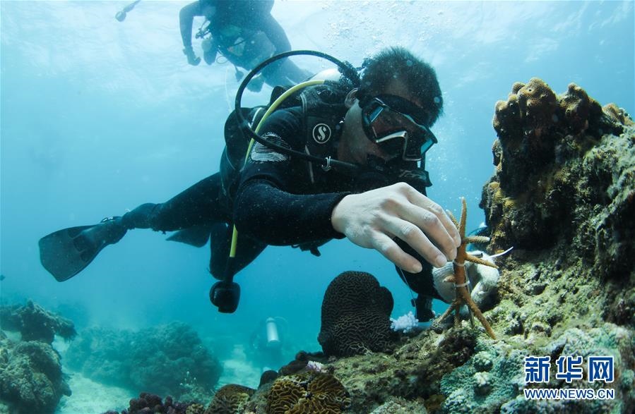 在海南三亞蜈支洲島海域,中科院南海海洋研究所副研究員張?jiān)£?yáng)團(tuán)隊(duì)工作人員在海底的移植釘上固定珊瑚(4月28日攝)。新華社記者楊冠宇攝