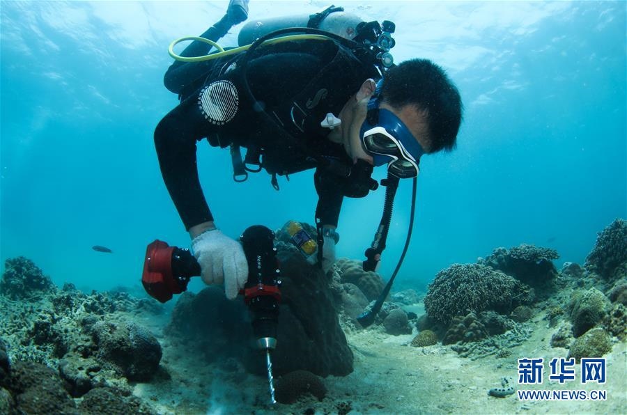 在海南三亞蜈支洲島海域,張?jiān)£?yáng)在海底鉆孔,以便安裝移植釘固定珊瑚(4月28日攝)。新華社記者楊冠宇攝
