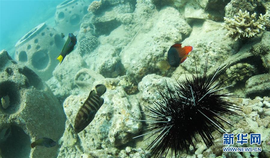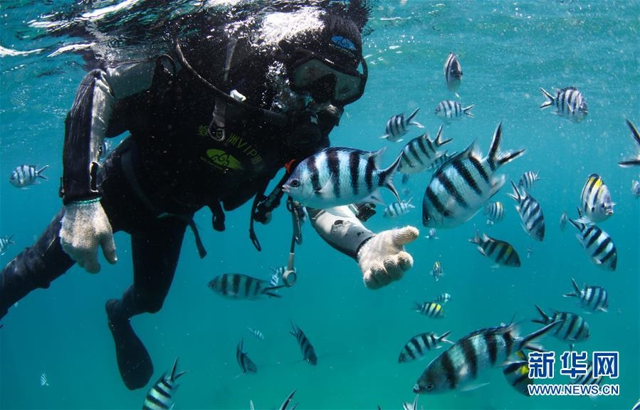 在海南三亞蜈支洲島海域拍攝的與??采男〕篝~(5月28日攝)。海南省三亞蜈支洲島海域海洋牧場(chǎng)是海南首個(gè)國(guó)家級(jí)海洋牧場(chǎng)示范區(qū),也是中國(guó)第一個(gè)位于熱帶地區(qū)的海洋牧場(chǎng)。近年來(lái),蜈支洲島海域海洋牧場(chǎng)推進(jìn)海洋生態(tài)系統(tǒng)的恢復(fù)和保護(hù),先后開展了人工魚礁投放、海洋環(huán)境修復(fù)、珊瑚移植等工作。截至2019年底,蜈支洲島海域海洋牧場(chǎng)共投放各類人工魚礁1526塊、船礁21艘和一批火山石礁,共達(dá)4萬(wàn)空立方米,礁區(qū)海域的漁業(yè)資源比非礁區(qū)要高5倍以上。目前,蜈支洲島海域海洋牧場(chǎng)已初現(xiàn)雛形。新華社記者楊冠宇攝