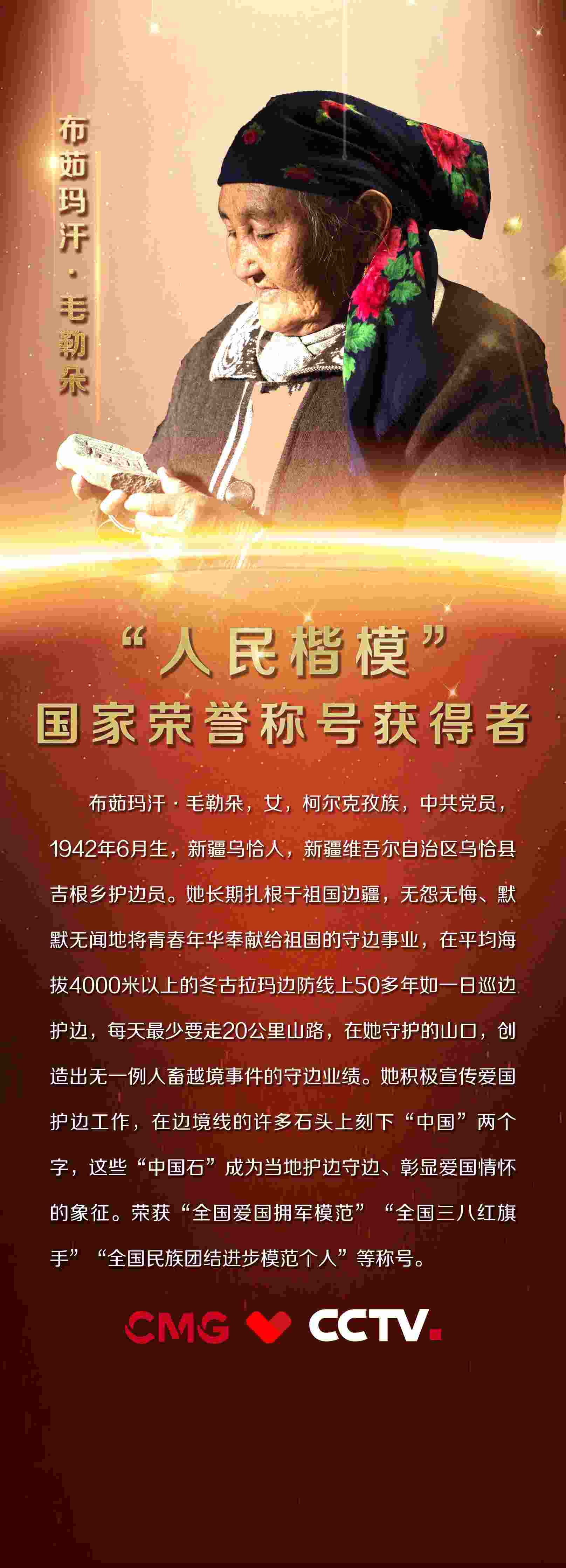 布茹瑪汗·毛勒朵,女,柯爾克孜族,中共黨員,1942年6月生,新疆烏恰人,新疆維吾爾自治區(qū)烏恰縣吉根鄉(xiāng)護(hù)邊員。她長期扎根于祖國邊疆,無怨無悔、默默無聞地將青春年華奉獻(xiàn)給祖國的守邊事業(yè),在平均海拔4000米以上的冬古拉瑪邊防線上50多年如一日巡邊護(hù)邊,每天最少要走20公里山路,在她守護(hù)的山口,創(chuàng)造出無一例人畜越境事件的守邊業(yè)績。她積極宣傳愛國護(hù)邊工作,在邊境線的許多石頭上刻下“中國”兩個字,這些“中國石”成為當(dāng)?shù)刈o(hù)邊守邊、彰顯愛國情懷的象征。榮獲“全國愛國擁軍模范”“全國三八紅旗手”“全國民族團(tuán)結(jié)進(jìn)步模范個人”等稱號。
