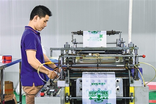 工作人員在海南??谡\佳美塑料包裝有限公司車間生產(chǎn)全生物降解袋(2020年11月4日拍攝)。新華社記者蒲曉旭攝