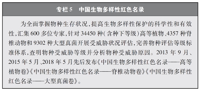 開展全國生物多樣性調(diào)查與評估。大力推進生物多樣性保護重大工程實施,結(jié)合自然資源調(diào)查、生態(tài)系統(tǒng)監(jiān)測評估等工作,不斷完善生物多樣性調(diào)查與評估能力,首次將生物多樣性指標納入生態(tài)質(zhì)量綜合評價指標體系,引導地方加強生態(tài)文明建設(shè)與生物多樣性保護。開展自然資源調(diào)查,包括森林、草原、水、濕地、荒漠、海洋等,建立自然資源調(diào)查評價監(jiān)測制度。構(gòu)建了涵蓋2376個縣級行政單元、樣線總長超過3.4萬公里的物種分布數(shù)據(jù)庫,建立物種資源調(diào)查及收集信息平臺,準確反映野生動植物空間分布狀況。完成長江經(jīng)濟帶、京津冀等國家戰(zhàn)略區(qū)域180多個縣級行政區(qū)生物多樣性調(diào)查與評估。組織開展近海漁業(yè)資源調(diào)查,初步掌握近海漁業(yè)資源狀況。陸續(xù)發(fā)布《中國植物紅皮書》《中國瀕危動物紅皮書》《中國物種紅色名錄》《中國生物多樣性紅色名錄》,基本掌握生物多樣性總體情況,為加強生物多樣性保護奠定了科學基礎(chǔ)。