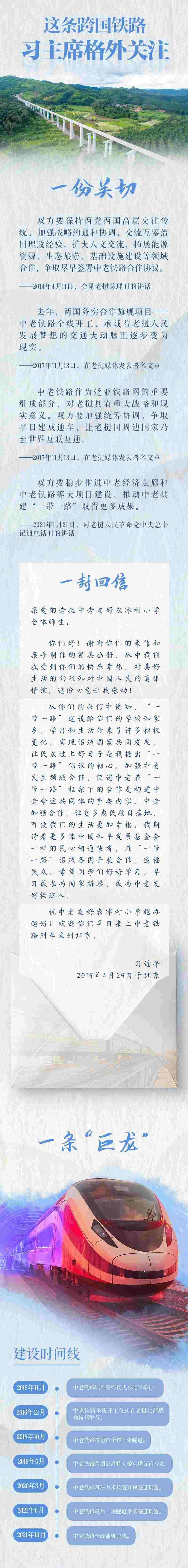中老鐵路北起中國昆明,南至老撾萬象,全長1000多公里。這條承載著友誼、科技、綠色、開放的跨國鐵路,是我國“一帶一路”倡議與老撾“變陸鎖國為陸聯(lián)國”戰(zhàn)略對(duì)接的重要項(xiàng)目,也是“一帶一路”倡議提出以后,首條以中方為主投資建設(shè)、全線采用中國技術(shù)標(biāo)準(zhǔn)、使用中國設(shè)備并與中國鐵路網(wǎng)直接聯(lián)通的跨國鐵路。對(duì)于這條鐵路,習(xí)近平主席一直格外關(guān)注。他與老撾高層多次就中老鐵路建設(shè)進(jìn)行深入溝通,并給老撾萬象中老友好農(nóng)冰村小學(xué)師生回信,歡迎他們早日乘上中老鐵路列車來到北京。