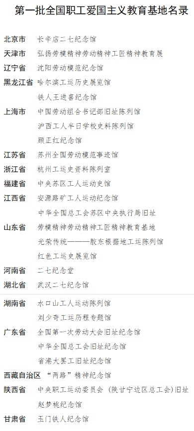 第一批全國職工愛國主義教育基地包括北京市長辛店二七紀念館、黑龍江省鐵人王進喜紀念館、上海市中國勞動組合書記部舊址陳列館、廣東省全國第一次勞動大會舊址紀念館、陜西省中央職工運動委員會(陜甘寧邊區(qū)總工會)舊址等27家單位。旨在進一步加強紅色工運資源的保護挖掘和宣傳利用,引領(lǐng)各級工會努力把紅色工運資源建設(shè)成為開展黨史學(xué)習(xí)教育的重要陣地,打造成愛國主義教育、革命傳統(tǒng)教育、加強職工思想政治引領(lǐng)的生動課堂,團結(jié)引導(dǎo)廣大職工群眾更好傳承紅色基因、賡續(xù)紅色血脈、汲取奮進力量。第一批全國職工愛國主義教育基地在中國工運史上影響重大,代表性強、知名度高,現(xiàn)有的設(shè)施建設(shè)和保護利用較好,符合時代要求,具有較強的示范引領(lǐng)作用。