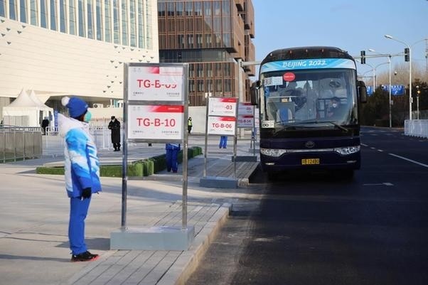 1月10日在主媒體中心外拍攝的交通班車乘車點(diǎn)。新華社記者 徐子鑒 攝