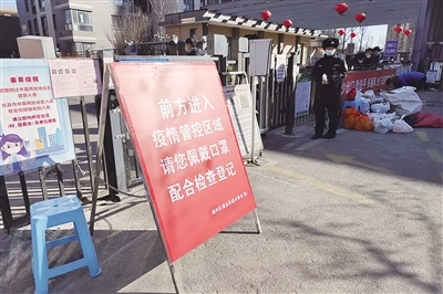 2月23日上午,通州區(qū)武夷花園月季園門前擺放著“前方管控區(qū)域”的告示牌。 新京報(bào)記者 王子誠(chéng) 攝