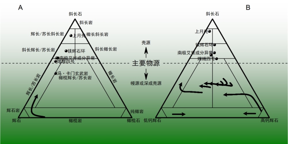 以往對南極-艾肯盆地物質(zhì)成分的研究大多只注重鎂鐵質(zhì)礦物,由于這一地區(qū)的鎂鐵質(zhì)異常特征,甚至引發(fā)了有關(guān)月幔是橄欖巖還是輝石巖的爭論。雖然根據(jù)月球巖漿洋假說,橄欖石和輝石是月幔的主要礦物,但是月殼形成之后的深成巖漿侵入作用同樣能夠在月殼中形成富集橄欖石或輝石的巖石,因此富集橄欖石或輝石并不能作為源自月幔的證據(jù)。迄今人類還沒有獲取南極-艾肯盆地的樣品返回地球,無法獲知其微量元素和同位素特征,通過遙感或原位探測可獲得的物質(zhì)成分信息中,斜長石含量也是區(qū)分殼源和幔源巖石的關(guān)鍵指標(biāo)。