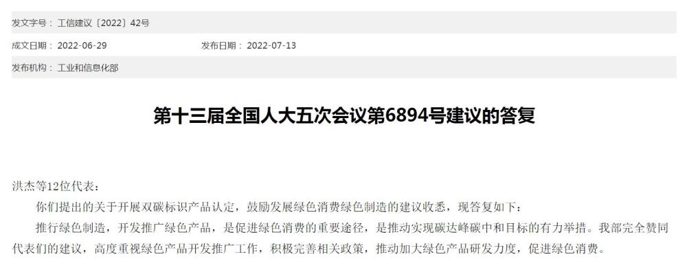 在答復中,工信部表示,推行綠色制造,開發(fā)推廣綠色產品,是促進綠色消費的重要途徑,是推動實現碳達峰碳中和目標的有力舉措。工信部完全贊同代表們的建議,高度重視綠色產品開發(fā)推廣工作,積極完善相關政策,推動加大綠色產品研發(fā)力度,促進綠色消費。