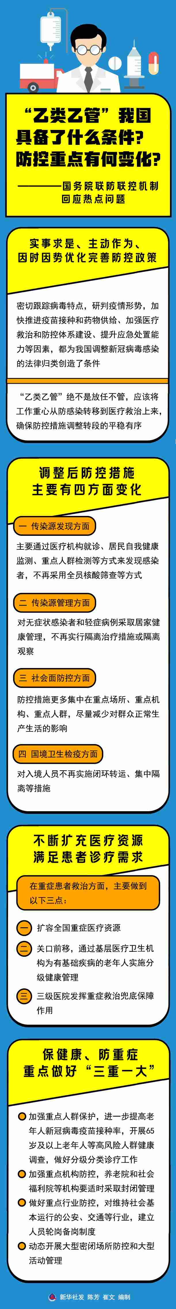 國(guó)家衛(wèi)生健康委疫情應(yīng)對(duì)處置工作領(lǐng)導(dǎo)小組專家組組長(zhǎng)梁萬年說,“乙類乙管”絕不是放任不管,應(yīng)該將工作重心從防感染轉(zhuǎn)移到醫(yī)療救治上來,確保防控措施調(diào)整轉(zhuǎn)段的平穩(wěn)有序。