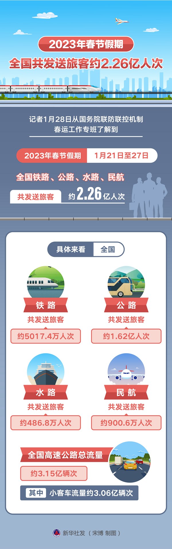 新華社北京1月28日電(記者葉昊鳴、樊曦)記者28日從國務(wù)院聯(lián)防聯(lián)控機(jī)制春運(yùn)工作專班了解到,2023年春節(jié)假期(1月21日至27日),全國鐵路、公路、水路、民航共發(fā)送旅客約2.26億人次。