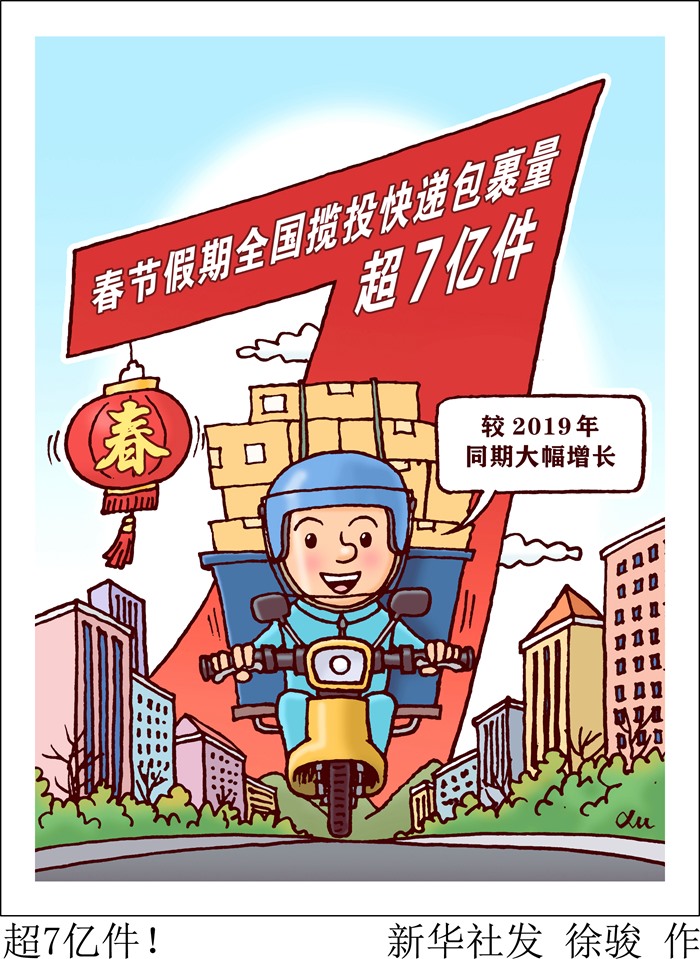 新華社北京1月28日電(記者戴小河)國家郵政局監(jiān)測(cè)數(shù)據(jù)顯示,1月21日至27日春節(jié)假期期間,全國郵政快遞業(yè)攬收快遞包裹約4.1億件,與去年春節(jié)假期相比增長5.1%,較2019年春節(jié)假期增長192.9%;投遞快遞包裹3.3億件,與去年春節(jié)假期相比增長10.0%,較2019年春節(jié)假期增長254.8%。