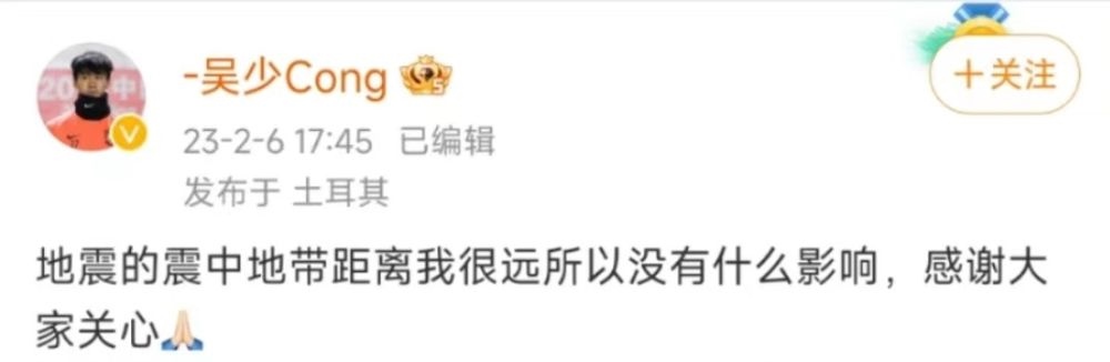 新華社北京2月7日電 土耳其發(fā)生強(qiáng)烈地震后,效力于土耳其職業(yè)聯(lián)賽的中國(guó)女足運(yùn)動(dòng)員李佳悅、男足運(yùn)動(dòng)員吳少聰,以及女排運(yùn)動(dòng)員任凱懿先后在社交媒體平臺(tái)上報(bào)平安。