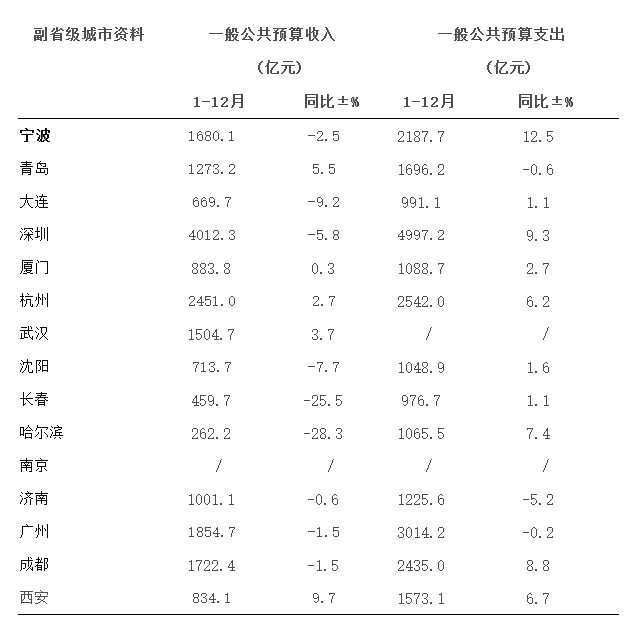 一般公共預算收入方面,除資料缺失的南京外,14座城市中有9座城市出現負增長,其中哈爾濱去年一般公共預算收入262.2億元,增速為-28.3%,一般公共預算支出1065.5億元,增速為7.4%。
