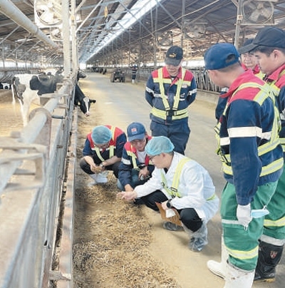 全國人大代表、內(nèi)蒙古蒙牛乳業(yè)(集團(tuán))股份有限公司研發(fā)創(chuàng)新部研發(fā)總監(jiān)史玉東(前排左三)在當(dāng)?shù)啬膛pB(yǎng)殖場調(diào)研。全國人大常委會辦公廳聯(lián)絡(luò)局供圖