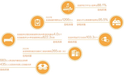 實(shí)實(shí)在在的舉措,帶來了實(shí)實(shí)在在的成效。城鄉(xiāng)學(xué)前教育公共服務(wù)體系基本建成,學(xué)前三年毛入園率由2011年的62.3%提高到2021年的88.1%。堅(jiān)持政府舉辦義務(wù)教育,九年義務(wù)教育鞏固率達(dá)95.5%,初中在校生5120.6萬(wàn)人,普通小學(xué)在校生10732.0萬(wàn)人;實(shí)施就業(yè)優(yōu)先戰(zhàn)略,確保就業(yè)局勢(shì)總體穩(wěn)定,2022年城鎮(zhèn)新增就業(yè)達(dá)1206萬(wàn)人,脫貧人口務(wù)工規(guī)模3278萬(wàn)人,100個(gè)城市公共就業(yè)服務(wù)機(jī)構(gòu)求人倍率為1.46,繼續(xù)保持在1以上,崗位供給大于求職人數(shù);著力解決群眾看病難、看病貴問題,人民健康水平穩(wěn)步提升,全國(guó)共有醫(yī)療衛(wèi)生機(jī)構(gòu)103.3萬(wàn)個(gè),醫(yī)療衛(wèi)生機(jī)構(gòu)床位975萬(wàn)張,參加基本醫(yī)療保險(xiǎn)人數(shù)達(dá)到134570萬(wàn)人;不斷推進(jìn)養(yǎng)老事業(yè)和養(yǎng)老產(chǎn)業(yè)協(xié)同發(fā)展,養(yǎng)老服務(wù)體系更加健全,全國(guó)提供住宿的民政服務(wù)機(jī)構(gòu)中養(yǎng)老機(jī)構(gòu)達(dá)4.0萬(wàn)個(gè),民政服務(wù)床位中養(yǎng)老服務(wù)床位達(dá)822.3萬(wàn)張;加快推進(jìn)住房保障和供應(yīng)體系建設(shè),2022年全年全國(guó)各類棚戶區(qū)改造開工134萬(wàn)套,基本建成181萬(wàn)套,全國(guó)保障性租賃住房開工建設(shè)和籌集265萬(wàn)套(間),群眾居住條件不斷改善;扎實(shí)做好因疫因?yàn)?zāi)遇困群眾和老弱病殘等特殊群體的基本生活保障,2022年年末,683萬(wàn)人享受城市最低生活保障,435萬(wàn)人享受農(nóng)村特困人員救助供養(yǎng),全年臨時(shí)救助1083萬(wàn)人次,保障網(wǎng)越織越密實(shí)。