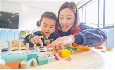 浙江省湖州市德清縣阜溪街道興山未來社區(qū)嬰幼兒照護(hù)驛站,幼兒在志愿者指導(dǎo)下拼搭積木。王樹成攝(影像中國(guó))