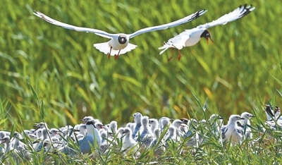 陜西省神木市紅堿淖國(guó)家級(jí)自然保護(hù)區(qū),遺鷗在島上飛翔。 新華社記者 陶 明攝