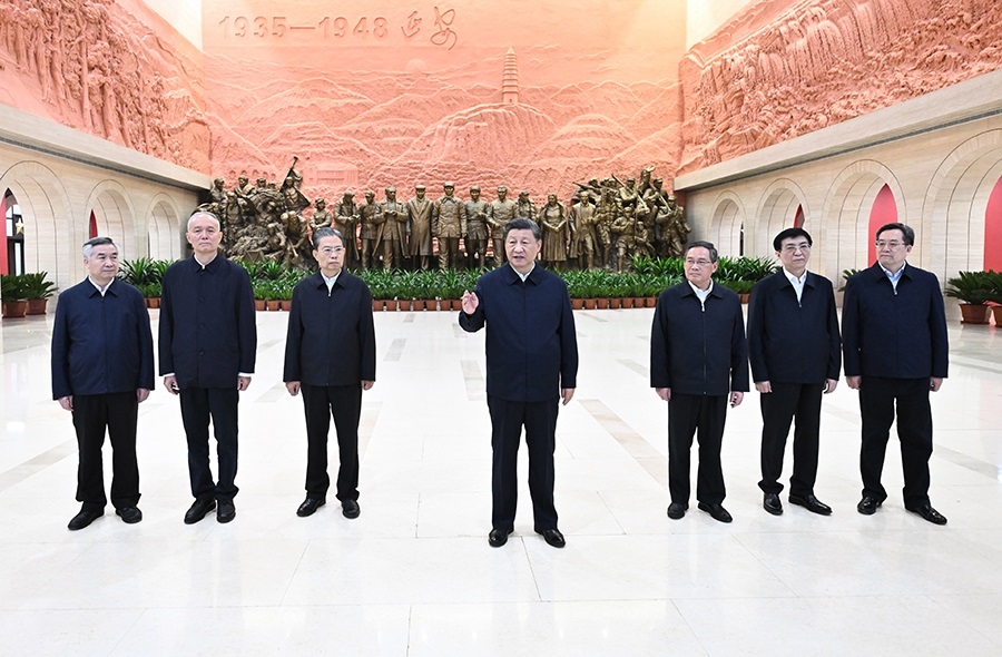 2022年10月27日,中共中央總書記、國家主席、中央軍委主席習(xí)近平帶領(lǐng)中共中央政治局常委李強(qiáng)、趙樂際、王滬寧、蔡奇、丁薛祥、李希,瞻仰延安革命紀(jì)念地。這是習(xí)近平在延安革命紀(jì)念館參觀《偉大歷程——中共中央在延安十三年歷史陳列》結(jié)束時發(fā)表重要講話。 新華社記者 燕雁/攝