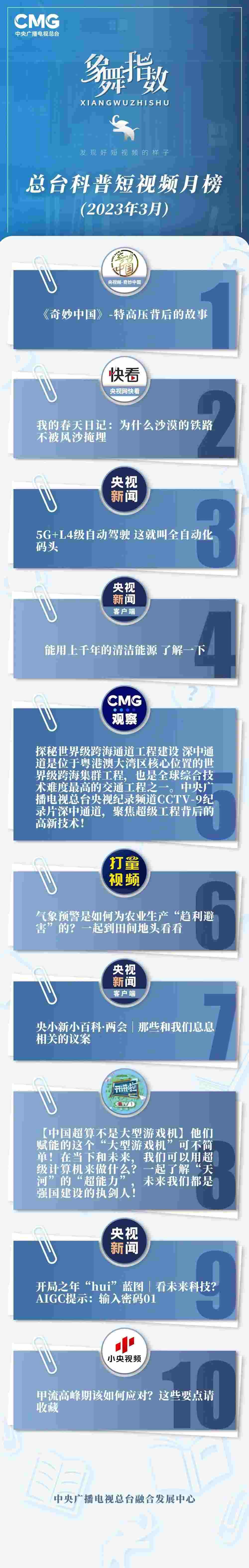 中央廣播電視總臺“象舞指數(shù)”評議品牌,推出科普短視頻月榜、總臺科普短視頻月榜。在2023年3月,值得注目的內(nèi)容有: