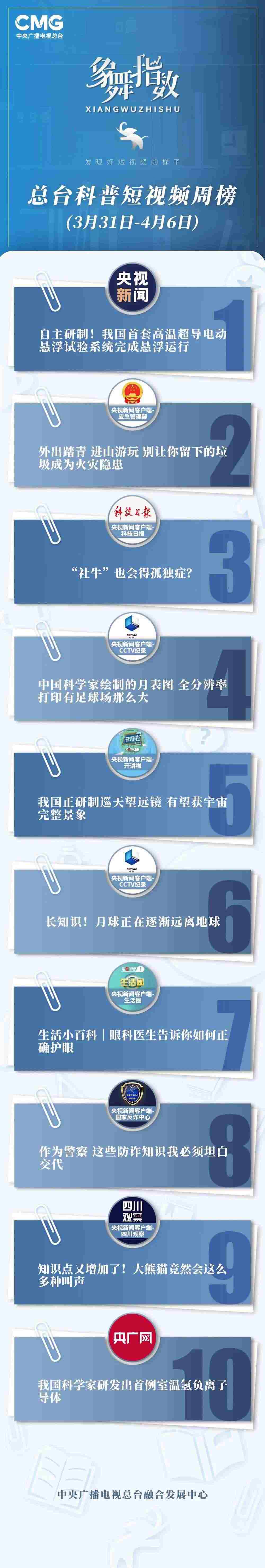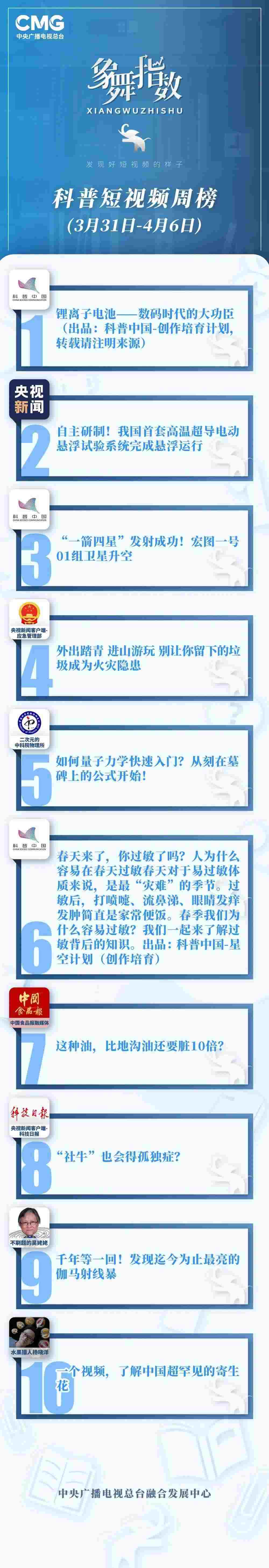 象舞指數(shù)|科普短視頻周榜(3月31日—4月6日)