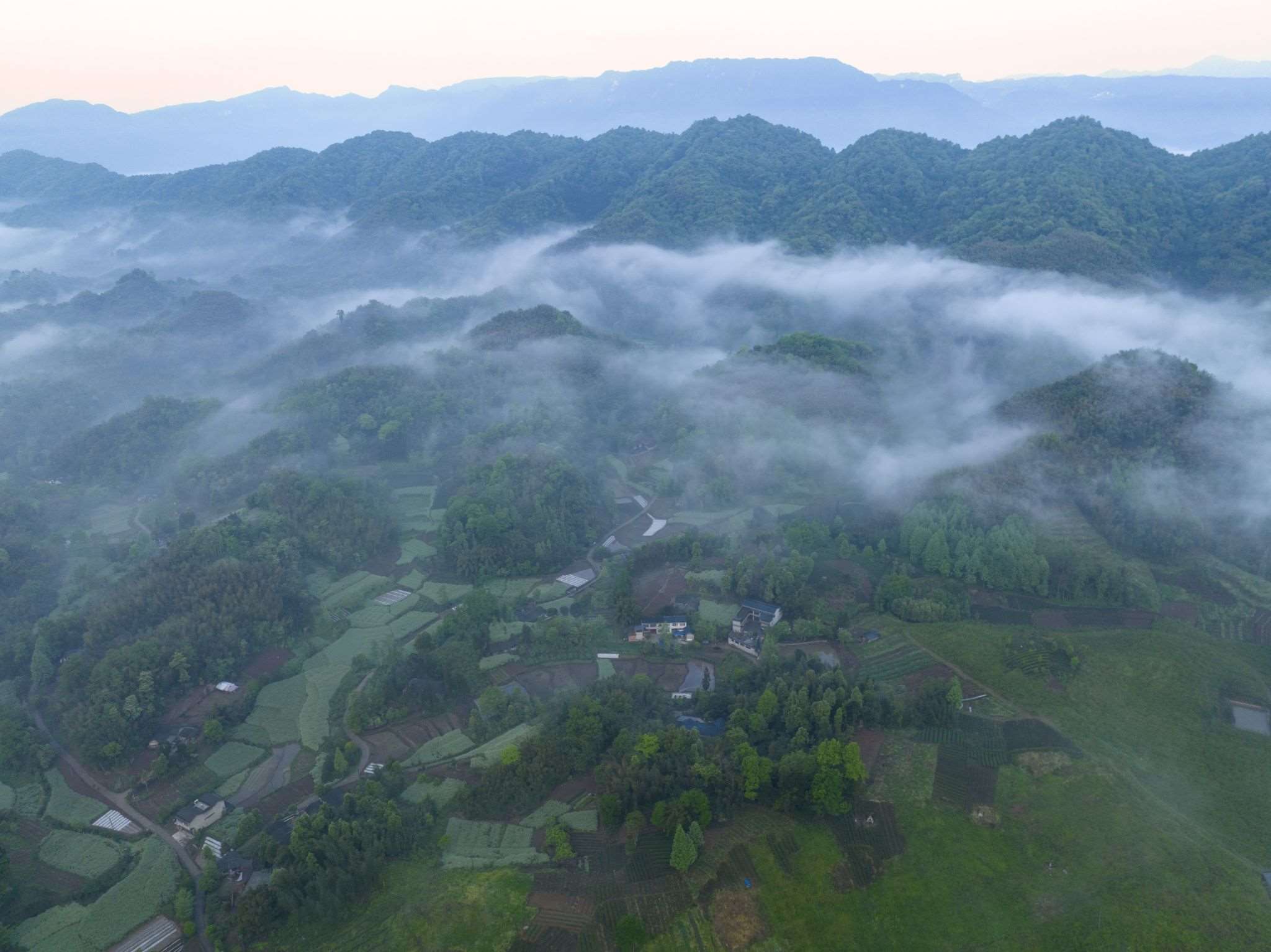 成都:鄉(xiāng)村薄霧輕旋 青山蒼翠