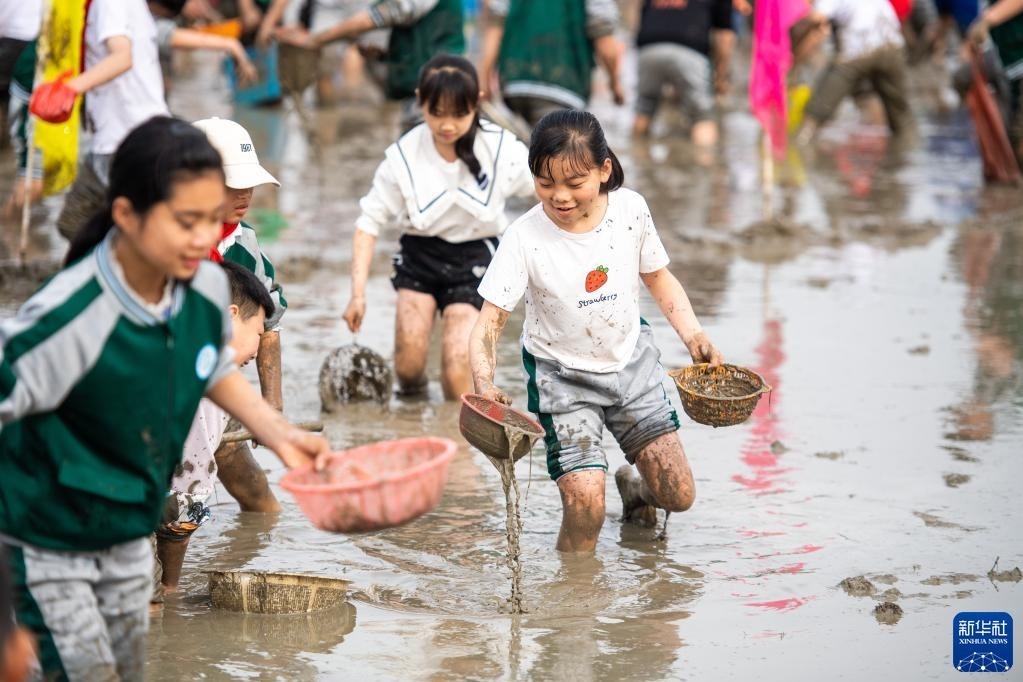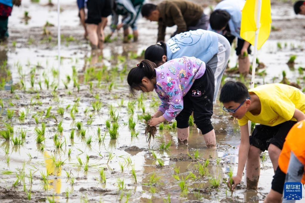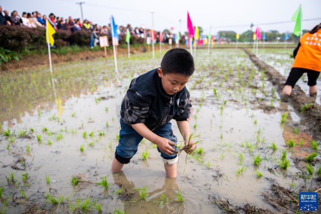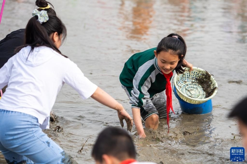 當(dāng)日,在湖南省長(zhǎng)沙市寧鄉(xiāng)市灰湯鎮(zhèn)花果山村舉行的農(nóng)耕民俗文化節(jié)學(xué)生研學(xué)活動(dòng)中,孩子們通過開展稻田插秧、捉泥鰍等“農(nóng)趣” 比賽,走進(jìn)田間地頭,感受勞動(dòng)帶來的艱辛與快樂。新華社記者 陳思汗 攝
